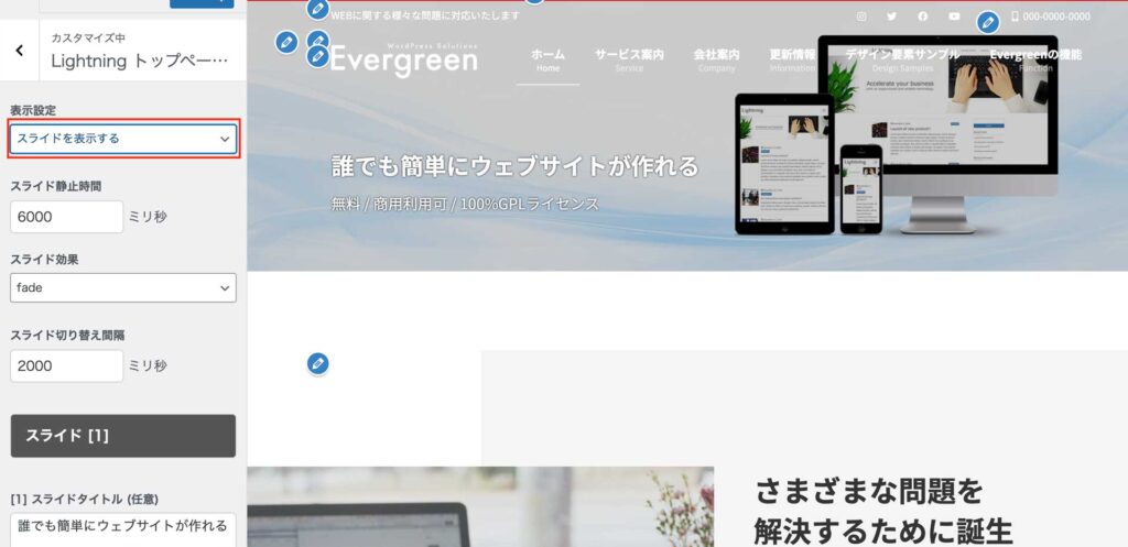 Evergreenのデモサイトでは、「Lightning トップページスライドショー」を非表示に設定しています。トップページに複数の画像を切り替えて表示するスライドショーを利用したい場合は、以下の手順をご参考ください。
